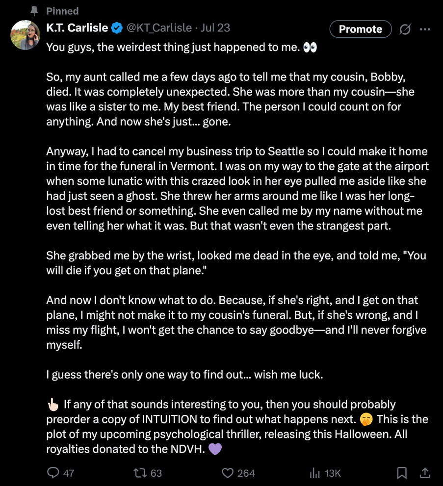 CTA language (i.e. "buy my book", "click the link below", "DM me for a free copy", etc.)